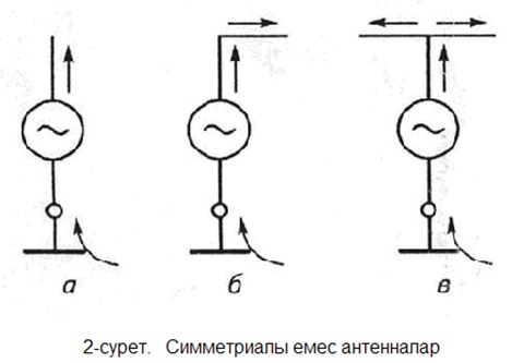 Орын толтыру кезінде фидердің бір сымын жүйеден алып тастауға болады. Бұл симметриялы емес вибраторды алуға көмектеседі.(2 а-сурет). Осы принципті қолданатын антеналардың бәрі бірдей симметриялы емес антенналар класына жатады. Оларға тағы да Г-типті және Т-типті антеналар жатады.(2 б,в-сурет)