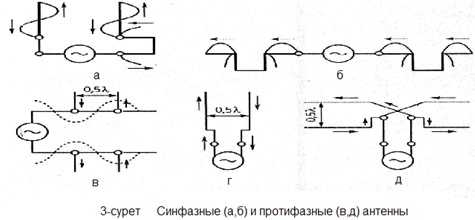 Егер көрші екі сым бір-бірін қаптаса және фазамен сай келсе, алаң бірін-бірі күшейтеді.Ол үшін толқын жарты ұзындығына фазаны ығыстыру керек, мысалы,бөлінбейтін шлейф есебінен.(3 а-сурет). Аса көп таратылған синфазалы антенаның принципі осыған негізделген.(3 б-сурет).