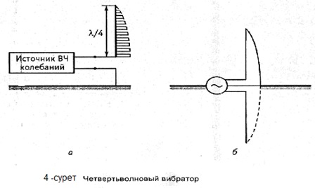 Егер жартытолқынды вибраторды вертикальды орналастырсақ, жердің құрылымының арқасында оның өлшемінде 2 есе кішірейтуге болады. Төменгі антенаның соңын вертикальды орналастырсақ электромагнитті тербеліс генераторының тұйықтағышына біреуіне қосамыз.(4 а-сурет). Ол екінші тұйықтағыш генератор жерге қосылады. Егер жерді идеалды өткізгіш деп қарастырсақ, онда ода Э.Қ.К бағытталады, негізгі вибратор айнадағы кескін ретінде көрсетіледі.(4 б-сурет).