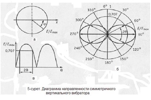 (5 б,в- суреттер). Максималды бағыттауыш сәуле шығару қуаты қуаттың сәуле шығыруы 2 есе кішірейеді. Қуат кернеуі алаңының квадратына пропорционал бағыттауыш диаграмма ерітіндісінің шамасын бір бөлінген түбірасты екі тең 0,707 шамада бұл алаң кернеуінен максималды сәуле шығаруға дейін анықтайды.