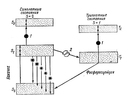 Синглет күй малекуладағы қозған электрондар спинінің шамасы нөлге тең болғанда, ал триплетті күй малекуладағы қозған электрондар спинінің шамасы бірге тең болғанда туады. Бояғыштағы лазерлердің тартуы фотондарды жұту кезінде пайда болады. Кейін малекулалар бастапқы күйіне және қозған күйіне келеді. Кейін күйден cәулелендірмейтін өткелге жылдам ауысады. жақын өткел арсында стимуьденген сәулелену жүреді. T1 және T2 триплетті күйлері сәуленің генерациялануына қатыспайды.