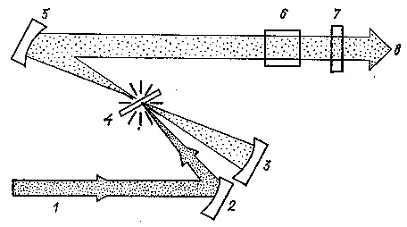 Резонатор шағылу кезінде пайда болды 3 (қисықтық радиусы r=5 см және шағылу коэффиценті R=100% ), тегіс шықпа айна 7(R=95-98%), қосалқы айна 5(r = 7,5 см, R=100%) резонатордың габаритының кемуі үшін қызмет етеді және лазердің шыға берісінде сәулеленудің параллелдігін 8 қамсыздандырады және тартуды сәулелендіреді 1, айнасының көлем бұрылысына бағытталған 2. Бояғыштардың ағыны 4 тегіс суретке перпендекуляр бағытталған және тартудың сәулеленуі Брюстер бұрышының астында орналасқан. Толқын ұзындығы селектирленген элементтің көмегімен орнығады 6.